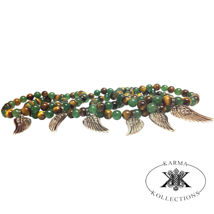 This signature stretch bracelet features a mixture of 8mm round jade green and 8mm round tiger-eye gemstone beads and is finished with a sliver wing charm.